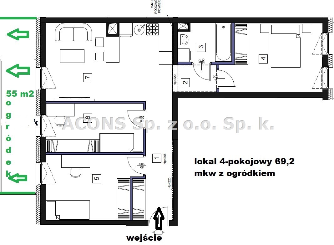 Przedmiotem oferty jest 4-pokojowe mieszkanie z miejscem parkingowym i ogródkiem 55m2. Garaż dodatkowo płatny 40000 zł.